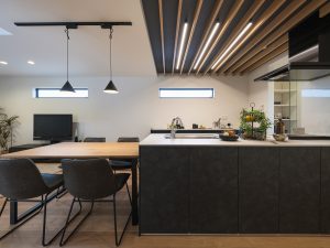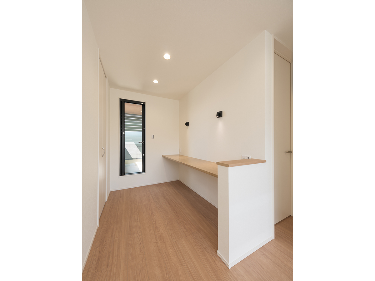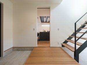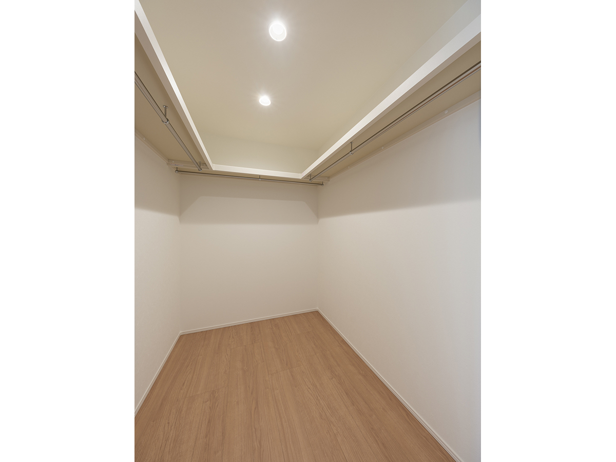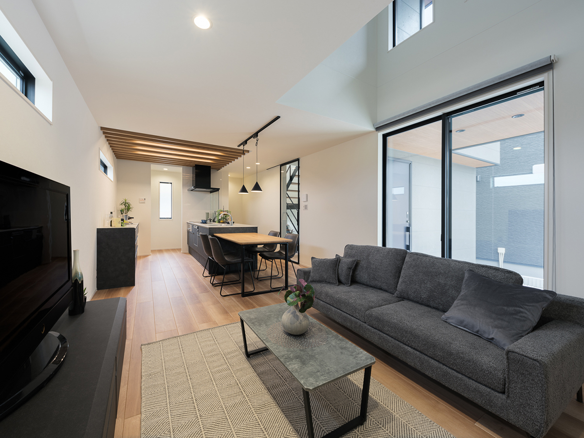 吹き抜けのスケルトン階段と地窓・高窓で明るく奥行きのある玄関。さらにリビングにも吹き抜けを設置。2階ホールのカウンターやFCL、主寝室の広いWICも注目です。