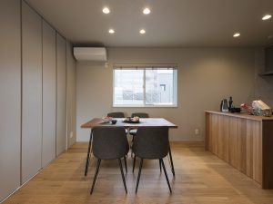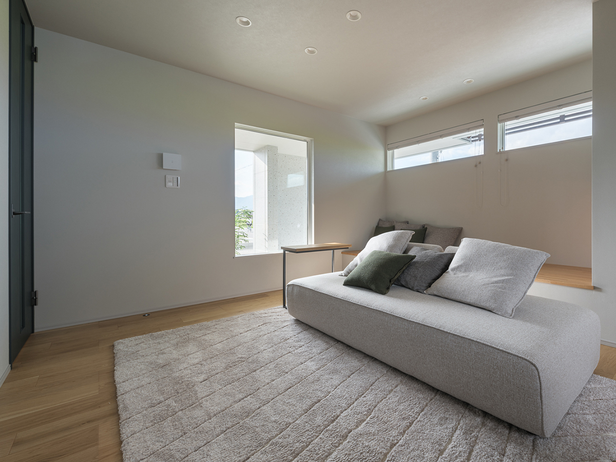 寝室と水廻りを2階に配し生活動線をコンパクトに、その分1階LDKはゆったり。小上がりベンチやFCL、パントリーを設置。