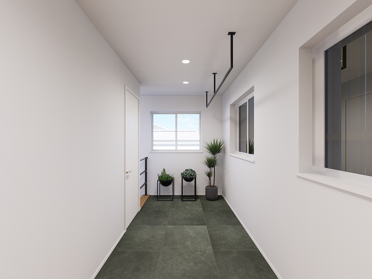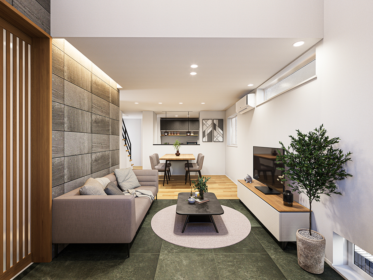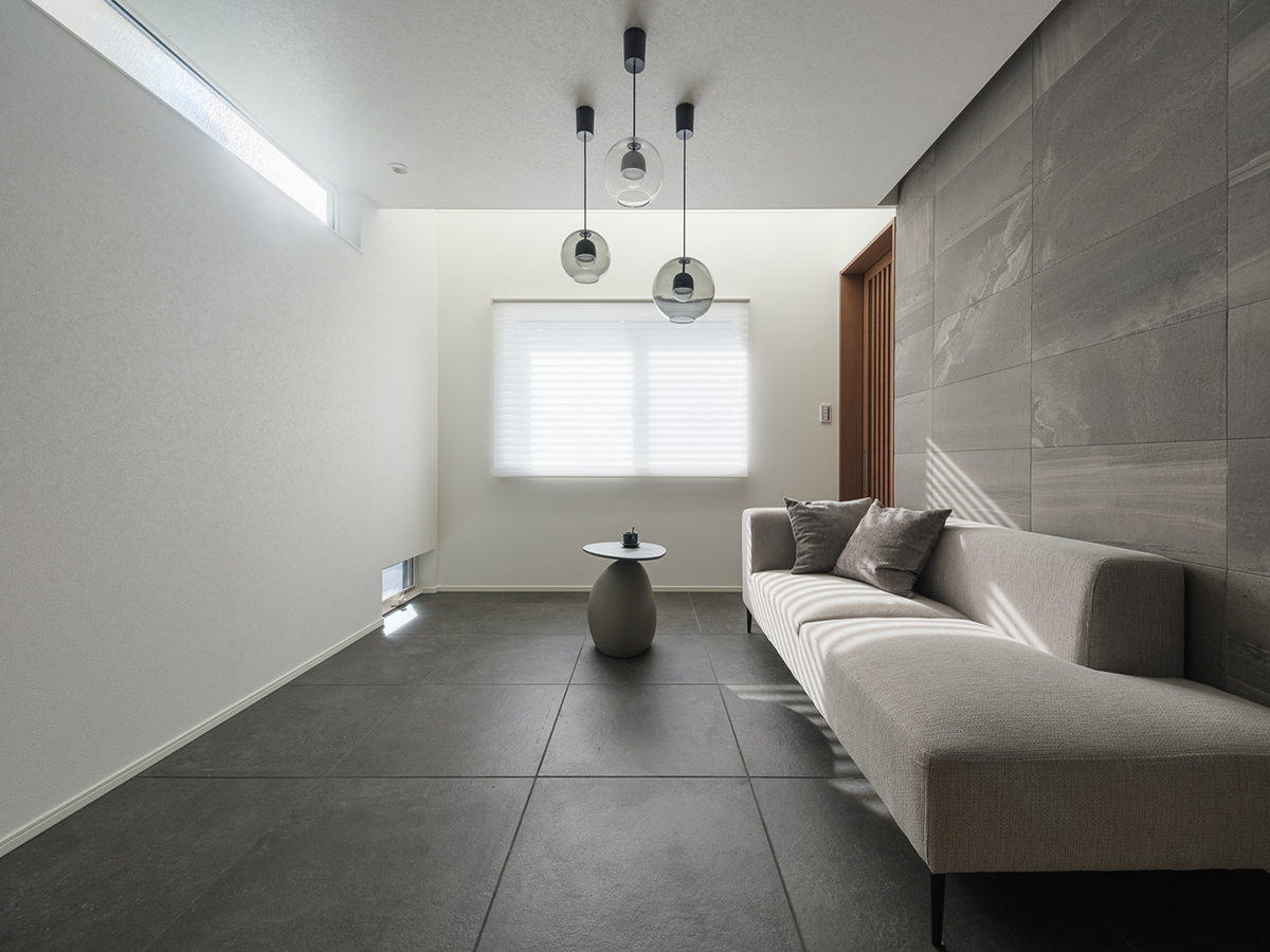 ポーチや玄関、リビング、2階ユーティリティにタイルを採用し空間の統一感とお洒落なゾーニングを実現。玄関からLDKへは便利な2way動線です。