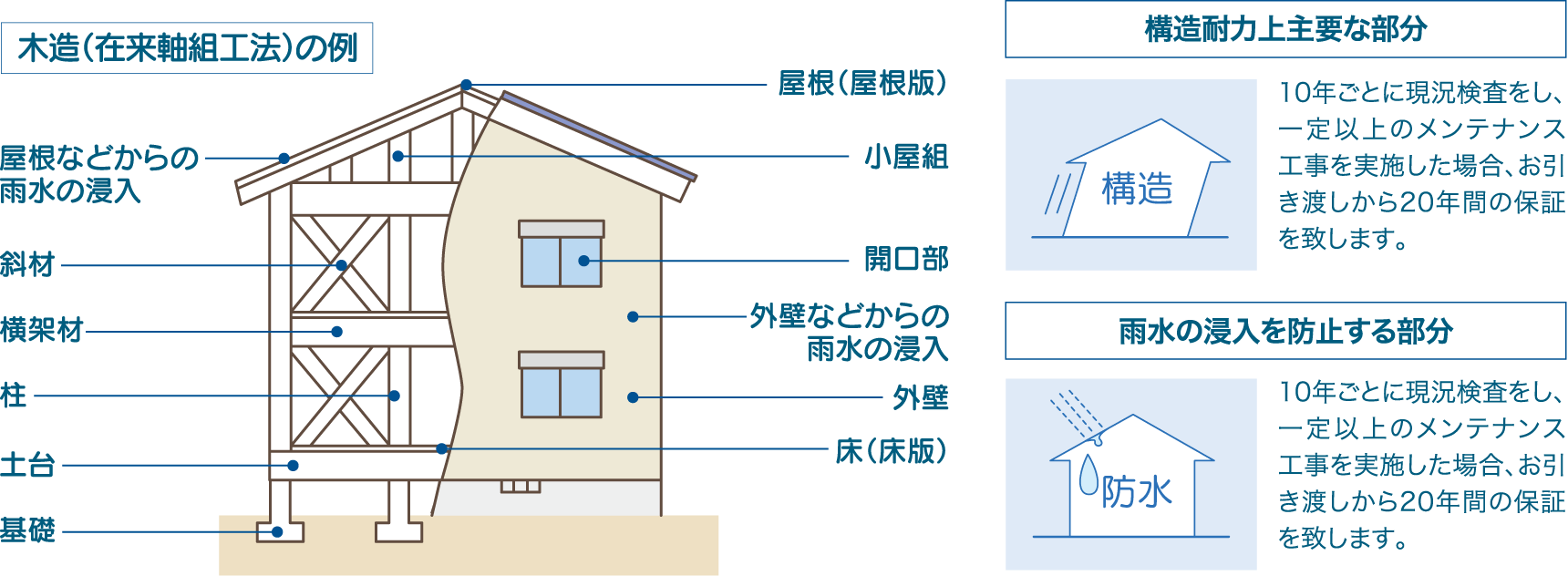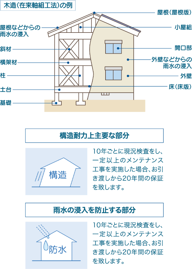 保証内容住宅の品質確保の促進等に関する法律で定められている「構造耐力上主要な部分」及び「雨水の浸入を防止する部分」の瑕疵については当社にて補修いたします。但し、当社以外で外壁工事・太陽光発電設備工事・増築等のリフォームをされた物件については、当該箇所ならびに関連部位に発生した事象については保証対象外となります。