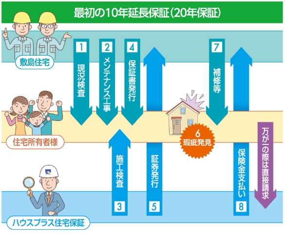条件- 10年目点検時に10年間の延長保証にお申込み頂けます。以降、20年目に再延長保証(10年間)にお申込み頂けます。これら延長保証は保証期間が連続(継続)している必要があります。