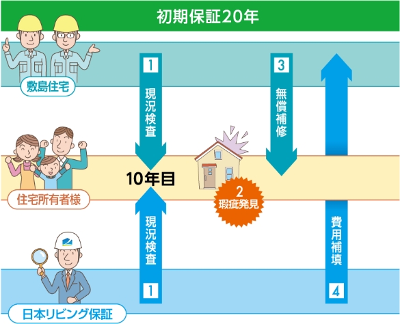 仕組みお引き渡しから当初10年間の保証、及び10年目~20年目の延長保証はハウスプラス住宅保証(株)の「住宅瑕疵延長保証保険」を付保しています。20年目~30年目の延長保証は当社の自社保証す。10年目、20年目に当社規定の無償点検と有償メンテナンス工事を行うことによって、最長30年(延長保証20年)まで保証を継続できます。いずれも保証期間中に「構造耐力上主要な部分」及び「雨水の浸入を防止する部分」について、保証対象事由が発生した場合、当社が責任をもって対応します。またオプションの住宅設備10年保証は、日本リビング保証(株)が受付の窓口となって修理依頼等に対応します。